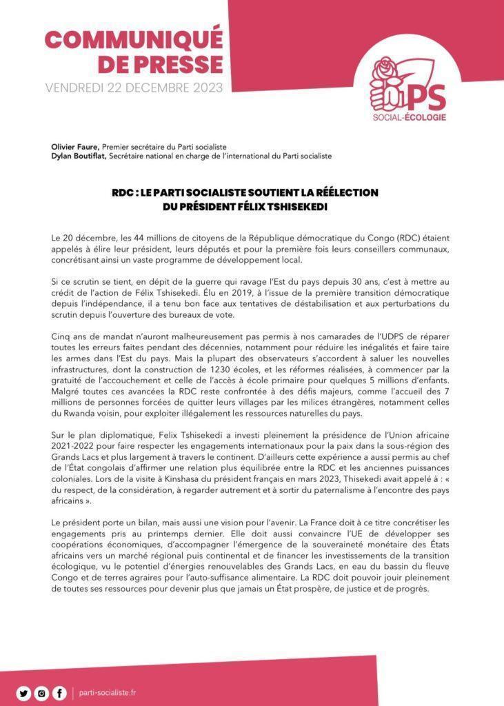 Dans un communiqué signé par son premier secrétaire, Olivier Faure, et son secrétaire national aux Relations internationales, Dylan Boutiflat, le PS salue le bilan du président Tshisekedi, notamment sur le plan du développement local et de la diplomatie.